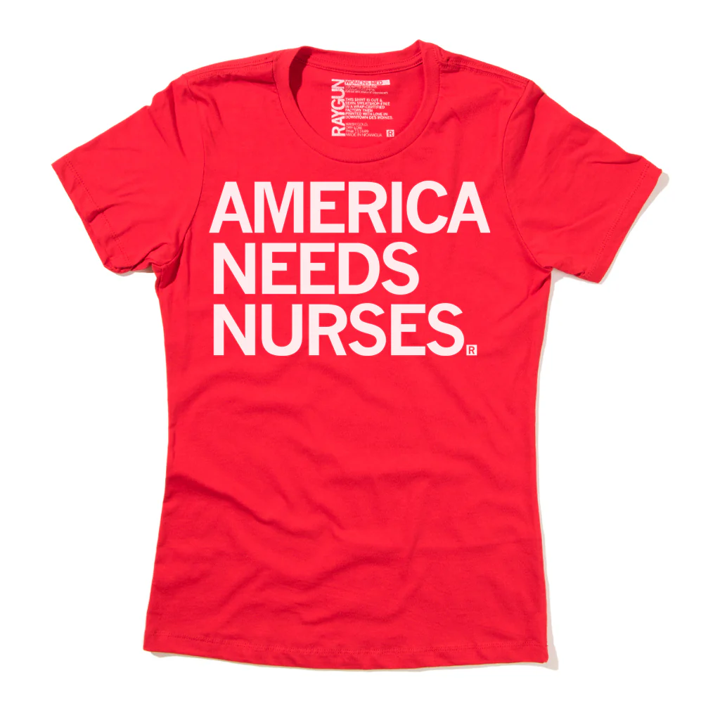 America Needs Nurses. A Portion of All RAYGUN Sales Raise Money For Organizations That We Support. White Screen Print on a Red T-shirt (100% Combed Ringspun Cotton). Cut and sewn sweatshop free. Designed and printed by Union Labor at RAYGUN.