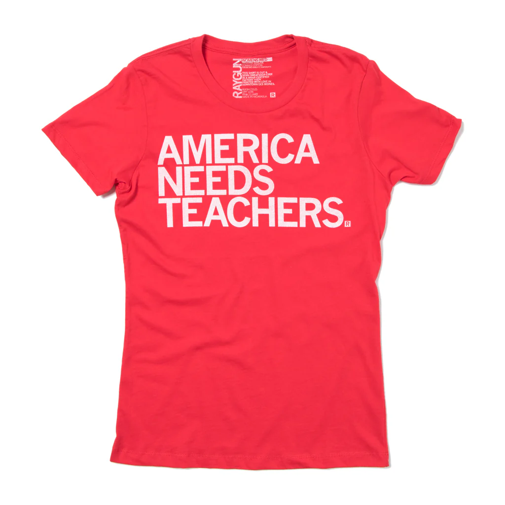 America Needs Teachers. RAYGUN has long supported public education, and sales of this shirt will help fund our continuing projects in the public school systems of Des Moines, Iowa City, Cedar Rapids, Chicago, and Kansas City areas. White Screen Print on a Red T-shirt (100% Combed Ringspun Cotton). Cut and sewn sweatshop free. Designed and printed by Union Labor at RAYGUN.