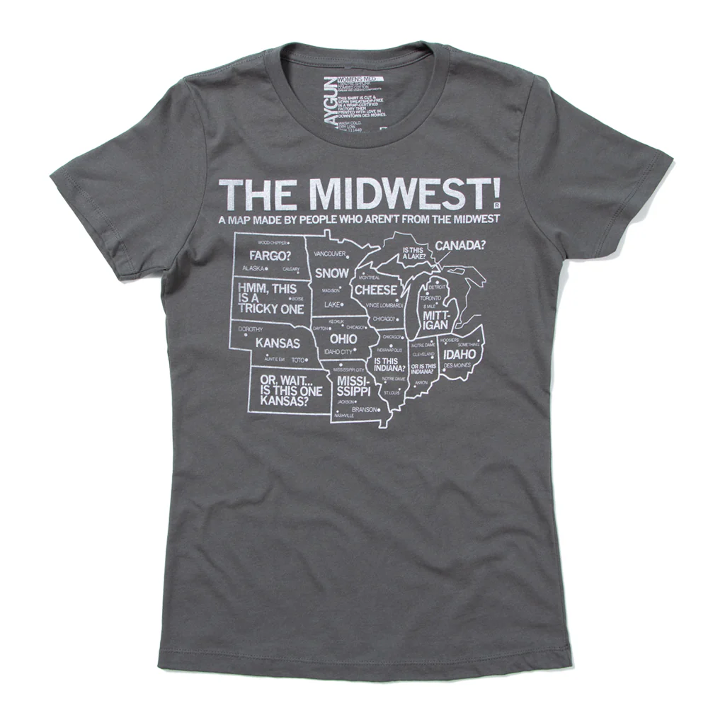 A Map of The Midwest By People Who Aren't From The Midwest. A Portion of All RAYGUN Sales Raise Money For Organizations That We Support. White Screen Print on a Heavy Metal T-shirt (100% Combed Ringspun Cotton). Cut and sewn sweatshop free. Designed and printed by Union Labor at RAYGUN.