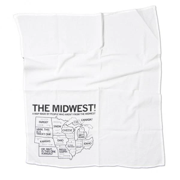 A Map of The Midwest Made By People Who Aren't From The Midwest. Black screen print on a 28" x 29" flour sack kitchen towel. Designed and printed by Union Labor at RAYGUN.