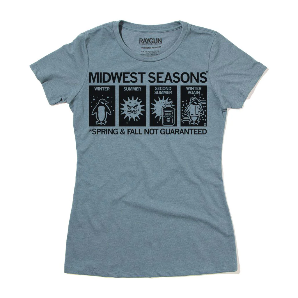 Midwest Seasons: Winter, Summer, Second Summer, Winter Again!  Spring And Fall Not Guaranteed. A Portion of All Raygun Sales Raise Money For Organizations That We Support. Black Screen Print on a Indigo T-shirt (60% Combed Ringspun Cotton / 40% Polyester). Cut and sewn sweatshop free. Designed and printed by Union Labor at RAYGUN.