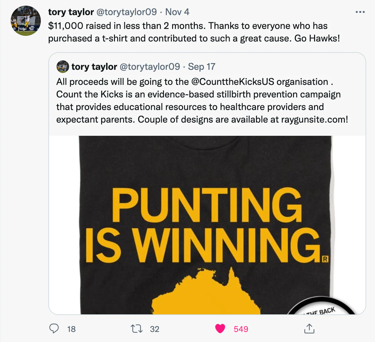Tory Taylor: Punting is Winning. Officially licensed with Tory Taylor. This shirt has been approved by Tory Taylor, with proceeds benefiting Count The Kicks. Gold Screen Print on a Charcoal T-shirt (50% Combed Ringspun Cotton 50% Polyester). Cut and sewn sweatshop free. Designed and printed by Union Labor at RAYGUN!