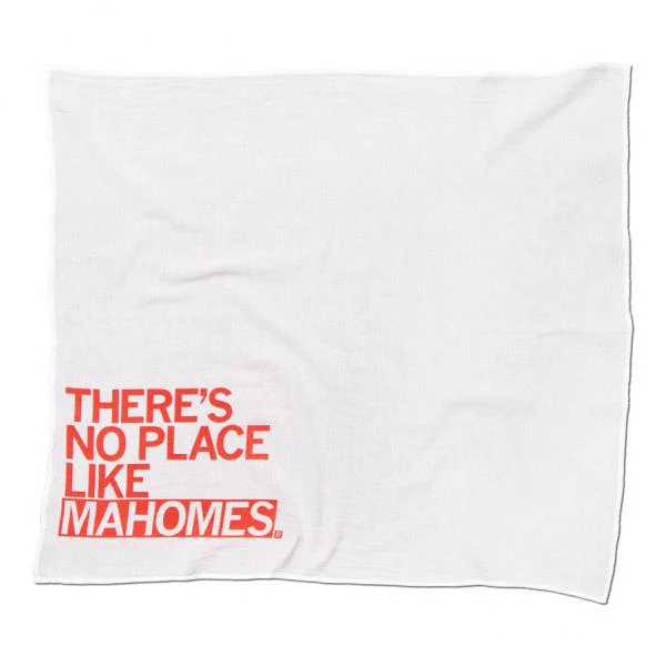 There's No Place Like Mahomes. Red screen print on a 28" x 29" flour sack kitchen towel. Designed and printed by Union Labor at RAYGUN.