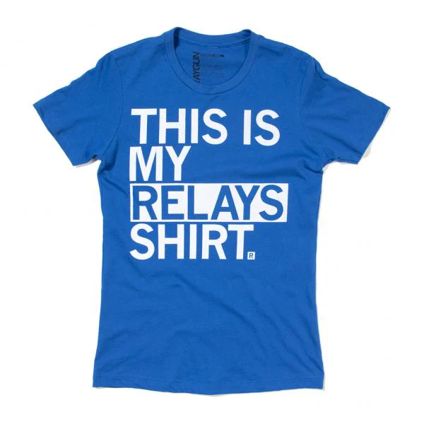 This Is My Relays Shirt. This Design Has Been Retired and is No Longer Available on Our Sales Floors But Can Be Ordered Here Online! Since All of Our Retired Designs Are Printed on Demand, Please Allow For a Couple Extra Days Before Shipping. A Portion of All Raygun Sales Raise Money For Organizations That We Support. White Screen Print on a Royal Blue T-shirt (100% Preshrunk Combed Cotton). Cut and sewn sweatshop free. Designed and printed by Union Labor at RAYGUN.